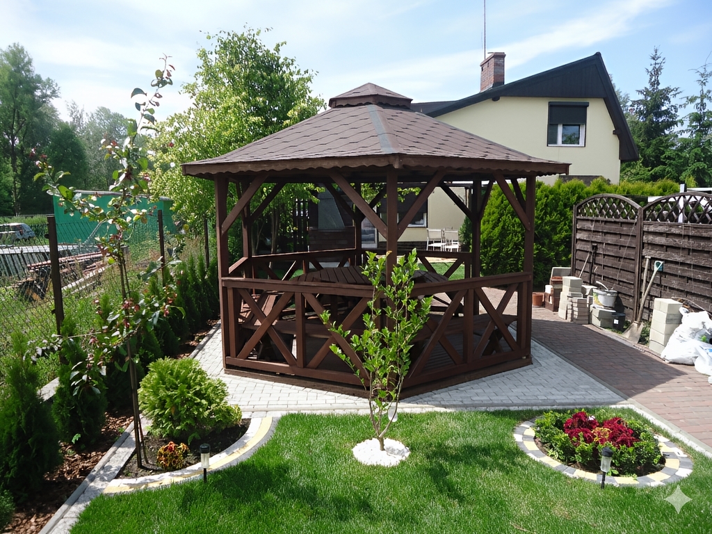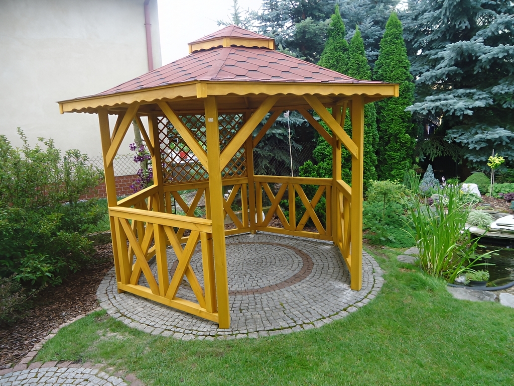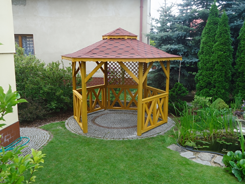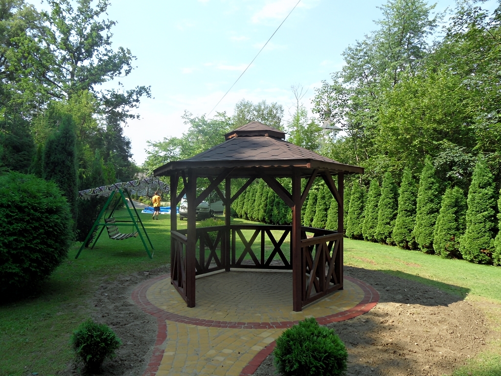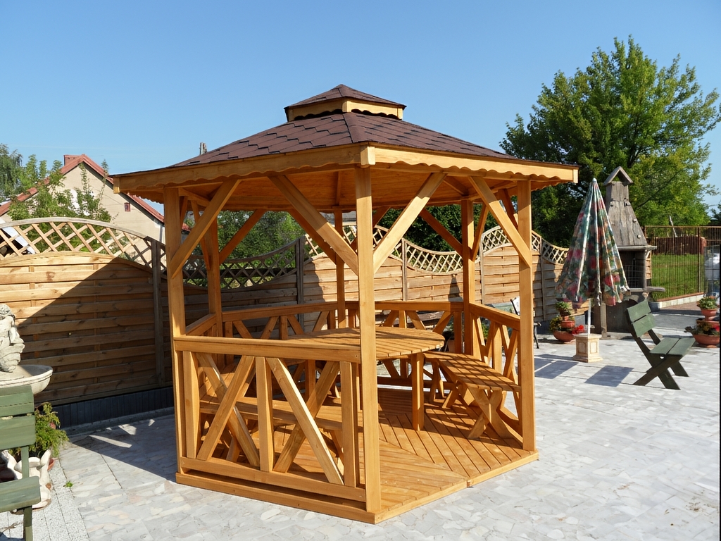 Altana sześciokątna wykonana z drewna sosnowego, malowana jednokrotnie impregnatem firmy Nelf, kryta gontem bitumicznym. Na wyposażeniu: podłoga, stół i ławki. Wysokość słupów 2 m, wysokość całej altanki 2,70 m. Na zdjęciu stół sześciokątny wykonany na życzenie Klienta.
