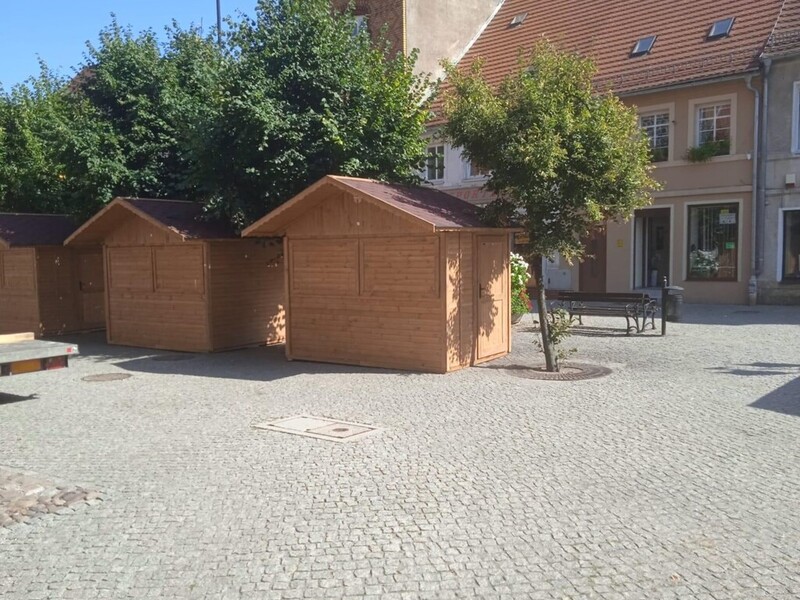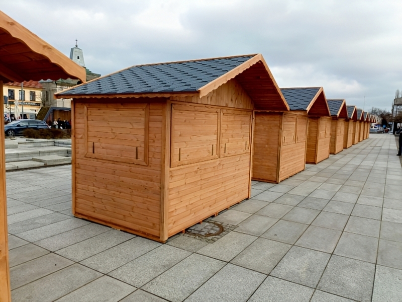 - Możliwość podziału: Opcjonalna ścianka działowa pozwala na stworzenie dwóch niezależnych boksów sprzedażowych wewnątrz jednego domku.