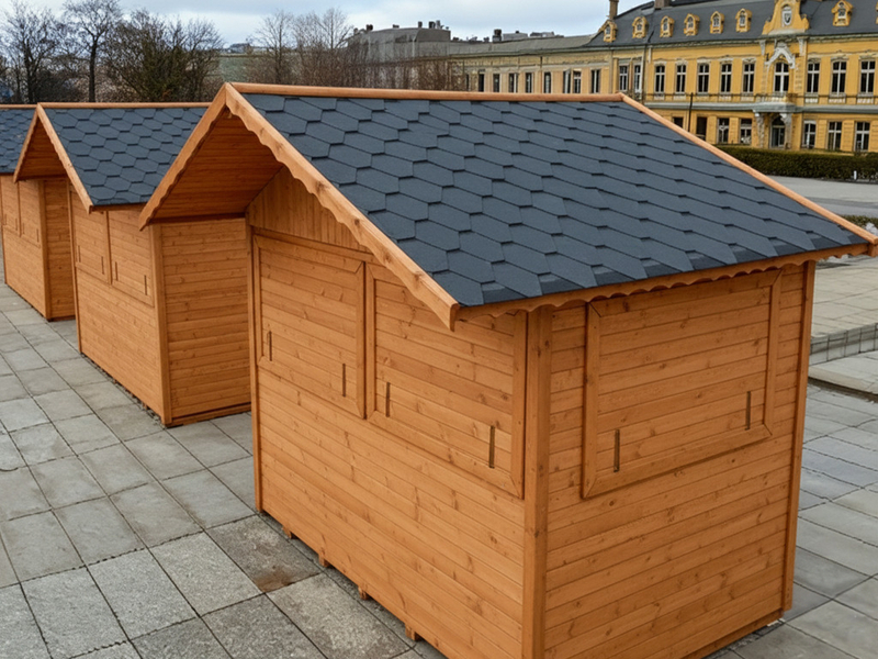 Domek Handlowy nr 3 to najbardziej funkcjonalny model pod kątem obsługi klienta. Dzięki zastosowaniu okien frontowych oraz dodatkowych okien bocznych, domek umożliwia równoczesną pracę nawet trzech ekspedientów. Solidna konstrukcja z okapem o głębokości 50 cm chroni towar i lady przed słońcem.