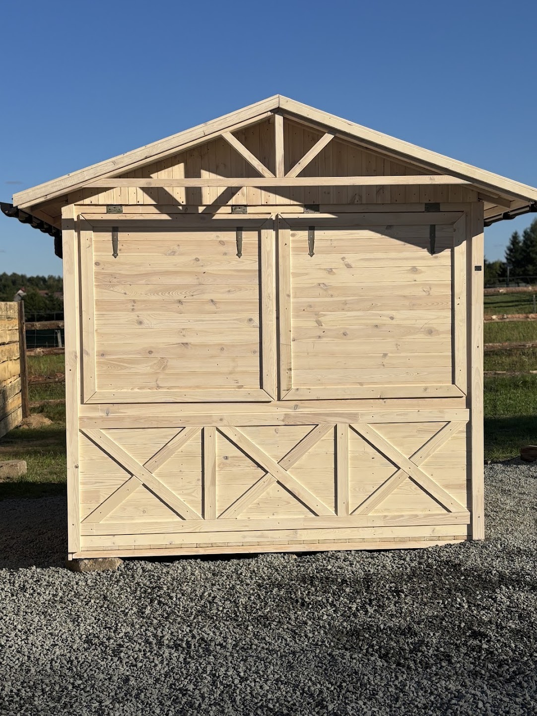 Domek HANDLOWY nr 4, 2,40x2 m (szer x głęb) dach dwuspadowy, wysunięty z przodu na ok. 60 cm, tworząc nad ladą sprzedażową wygodny okap. Całość ścian odeskowana metodą na pióro i wpust.